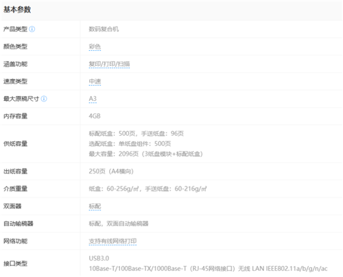 产品类型:数码复合机 颜色类型:彩色 最大原稿尺寸:A3 复印分辨率:600×600dpi 速度类型:中速 复印速度:A4横向:黑白:30cpm,彩:30cpm 主机尺寸:590×65